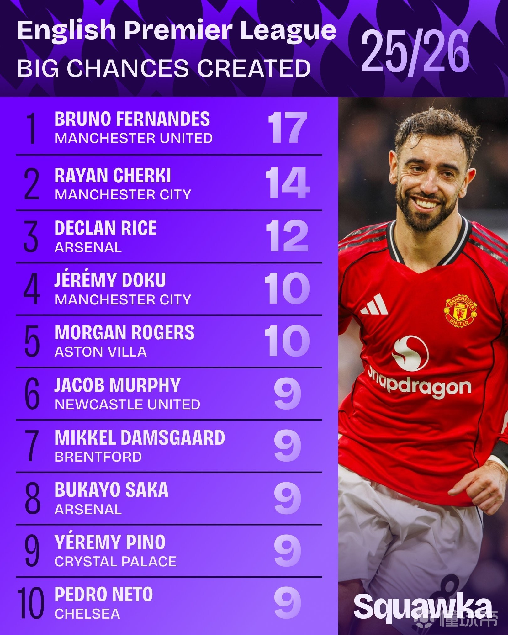 据足球数据网站Squawka的统计,本赛季至今,布鲁诺-费尔南德斯在英超已创造17次重大机会,领跑榜单,谢尔基14次、赖斯12次分别排在第二、第三名。